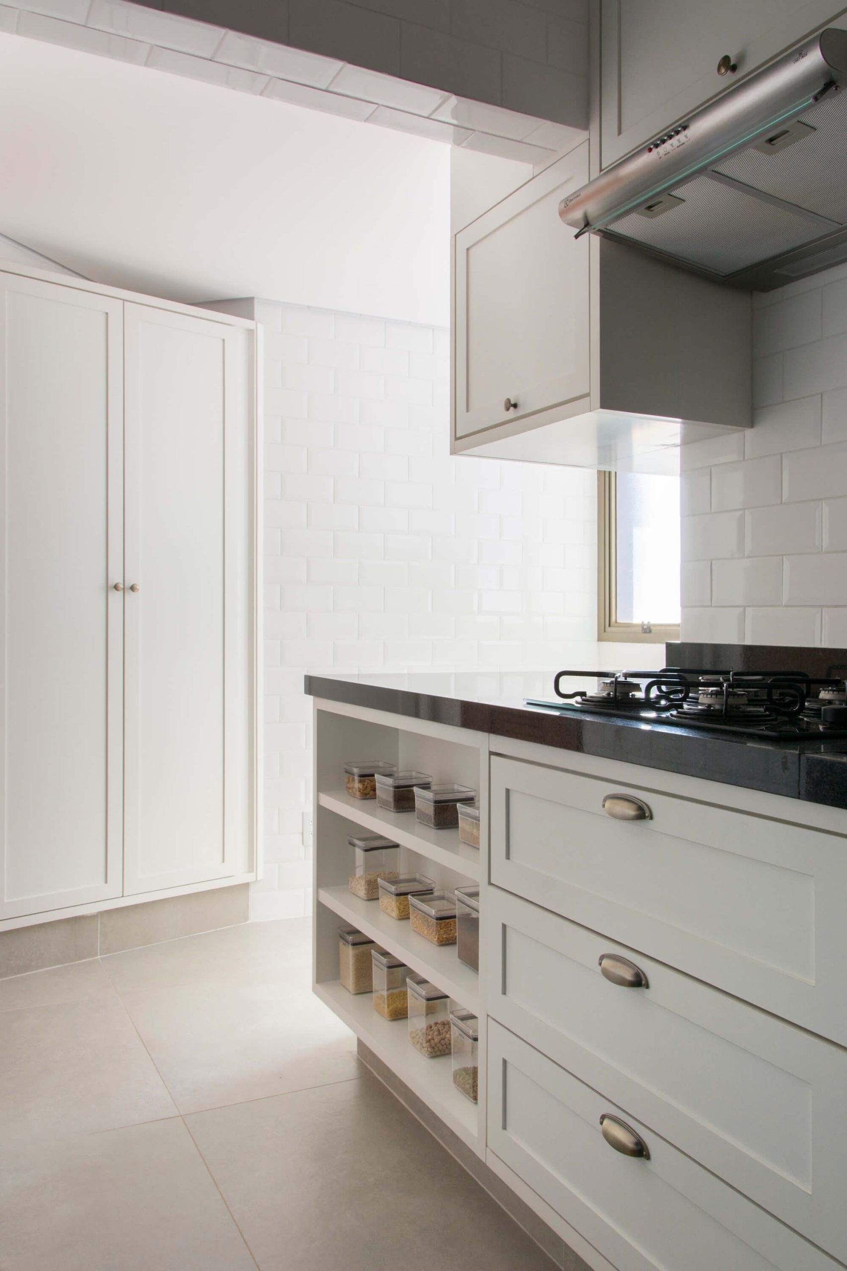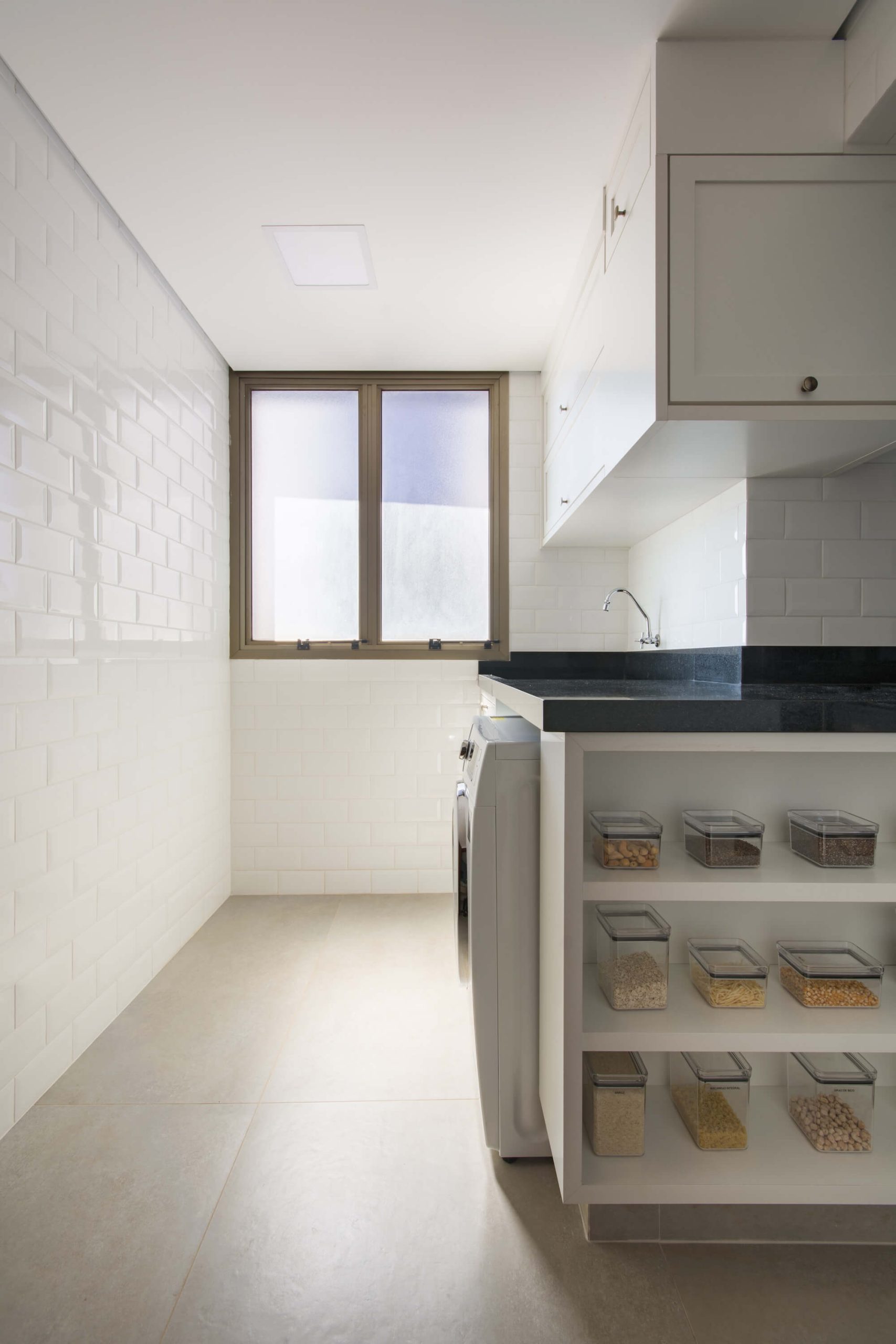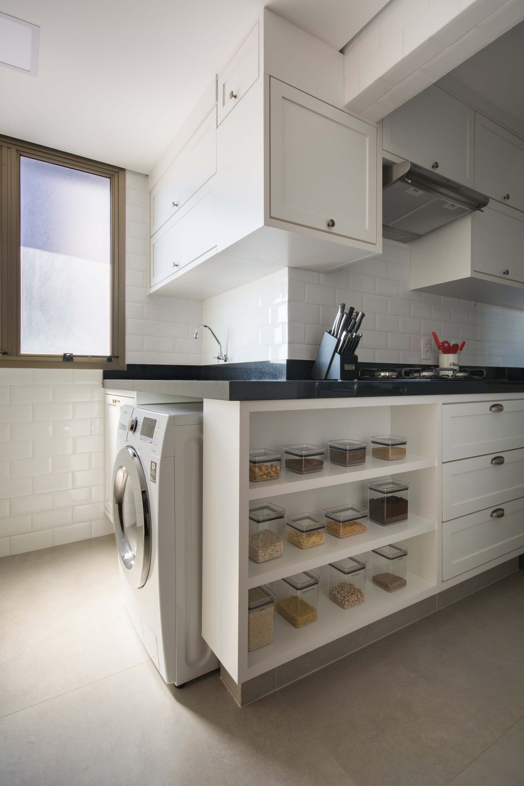 Beyond the renovation, the interior design sought lightness and comfort through a Scandinavian-inspired chromatic atmosphere: the same gray-toned flooring throughout the entire home, light-toned cabinetry, masonry covered with white tiles, black granite countertops, and lighting combining track, pendant, and recessed fixtures. The remaining masonry section between the kitchen and dining room served to concentrate all electrical demands, as well as to support a coffee niche, refrigerator, and oven tower in the kitchen, and a display cabinet designed to also function as a buffet in the dining room.