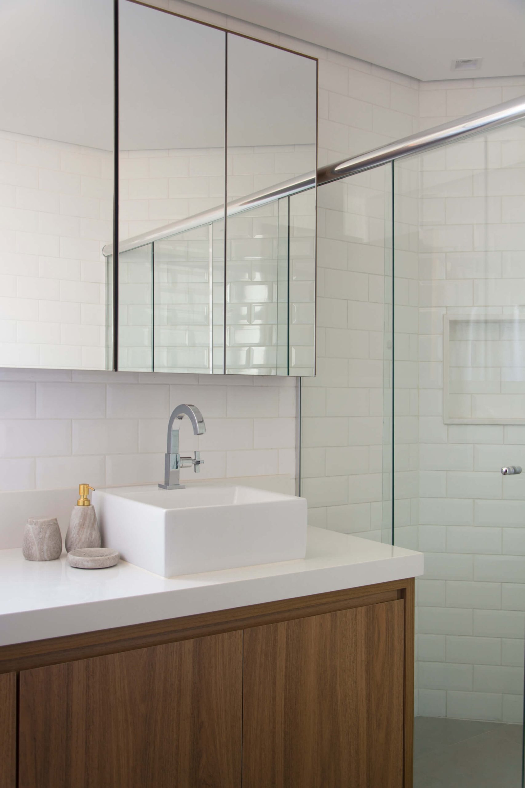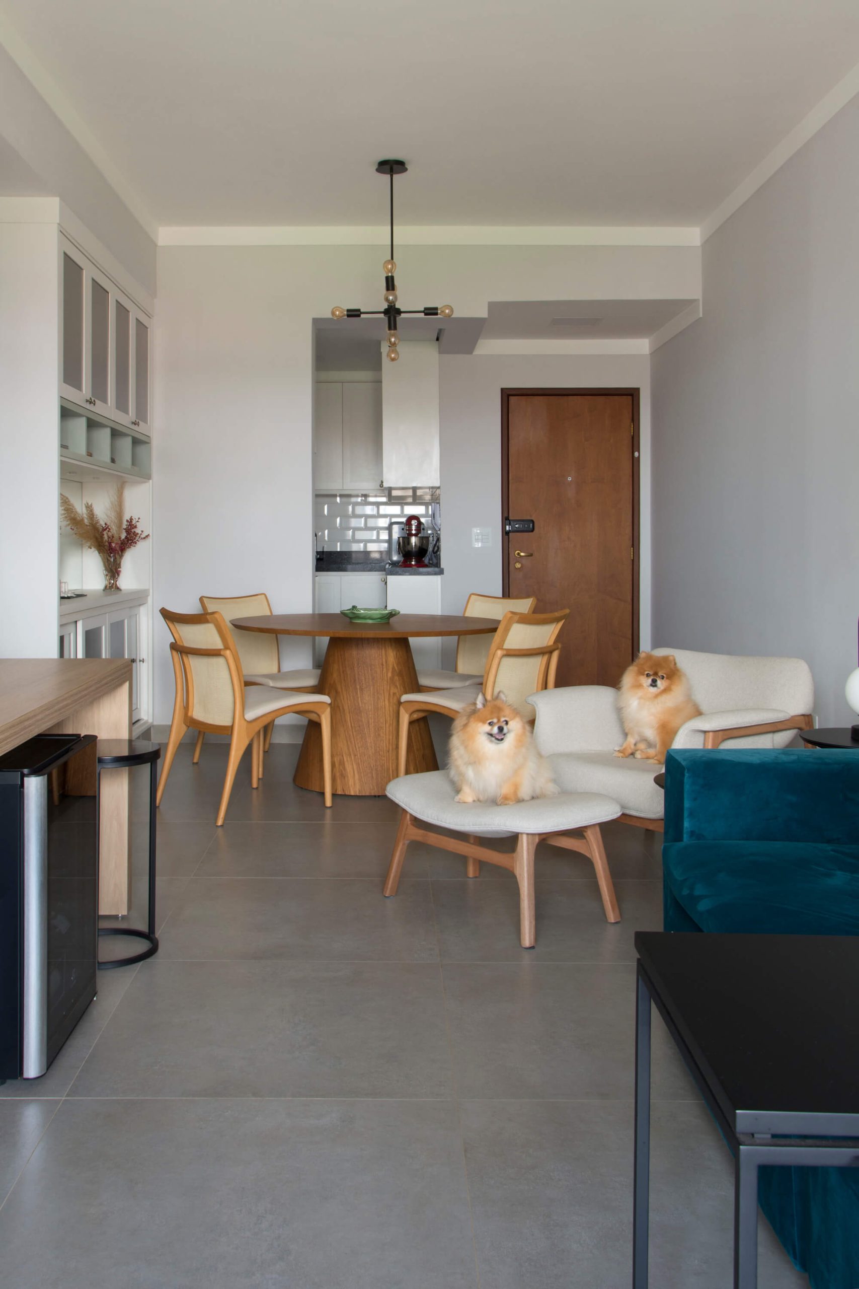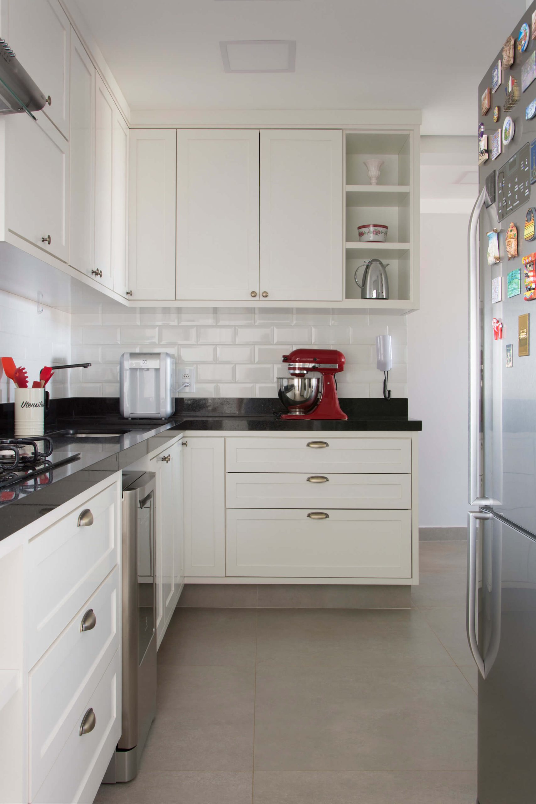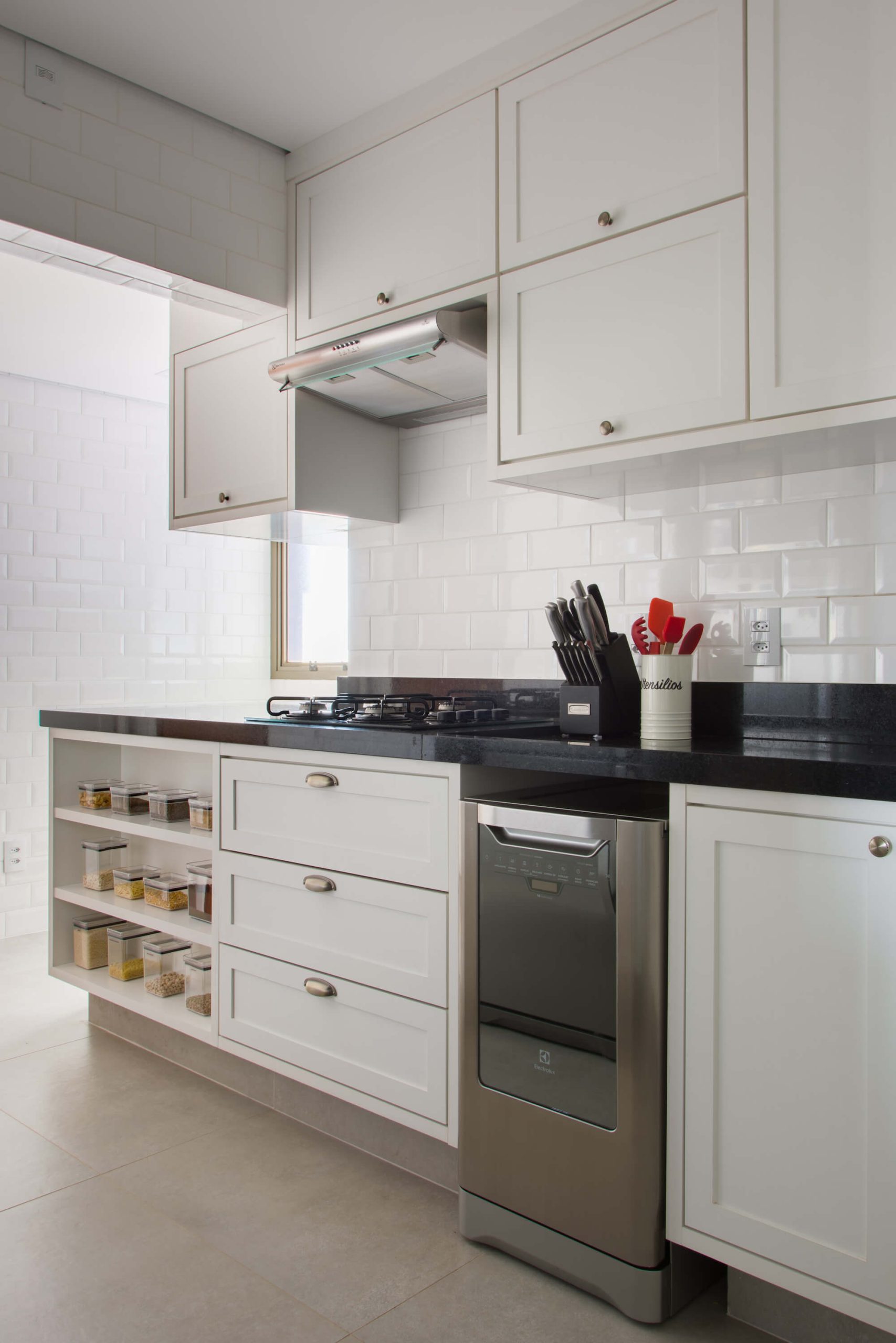 Beyond the renovation, the interior design sought lightness and comfort through a Scandinavian-inspired chromatic atmosphere: the same gray-toned flooring throughout the entire home, light-toned cabinetry, masonry covered with white tiles, black granite countertops, and lighting combining track, pendant, and recessed fixtures. The remaining masonry section between the kitchen and dining room served to concentrate all electrical demands, as well as to support a coffee niche, refrigerator, and oven tower in the kitchen, and a display cabinet designed to also function as a buffet in the dining room.