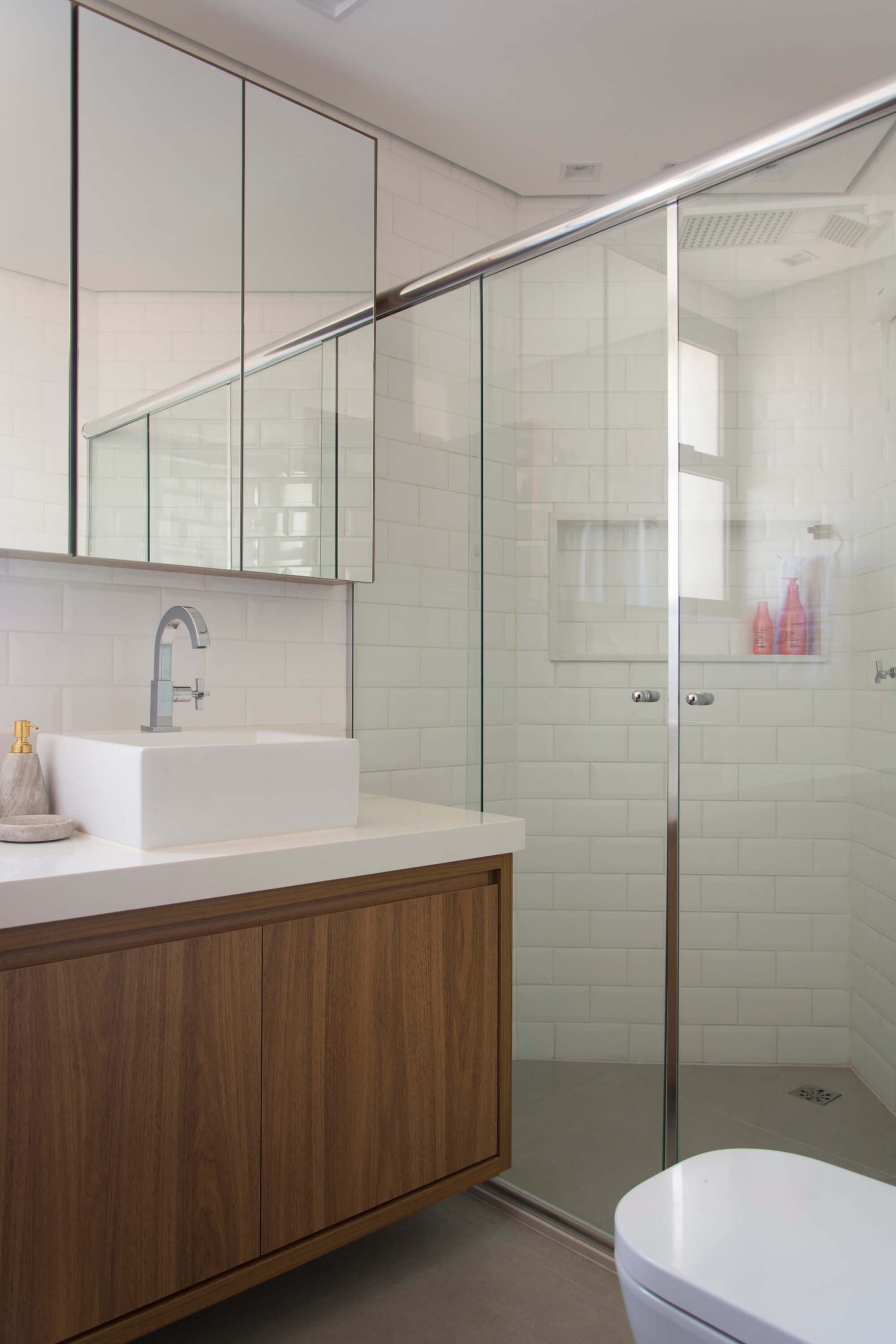 Several other strategies were adopted in the project: replacing finishes, fixtures, and sanitary ware in wet areas; designing niches to conceal air conditioning units on the balcony; creating a mirrored shoe storage area in the master suite; along with designing all apartment cabinetry, including furniture such as bedside tables and a TV stand for the living room; and specifying comfortable furnishings to suit the clients’ lifestyle.