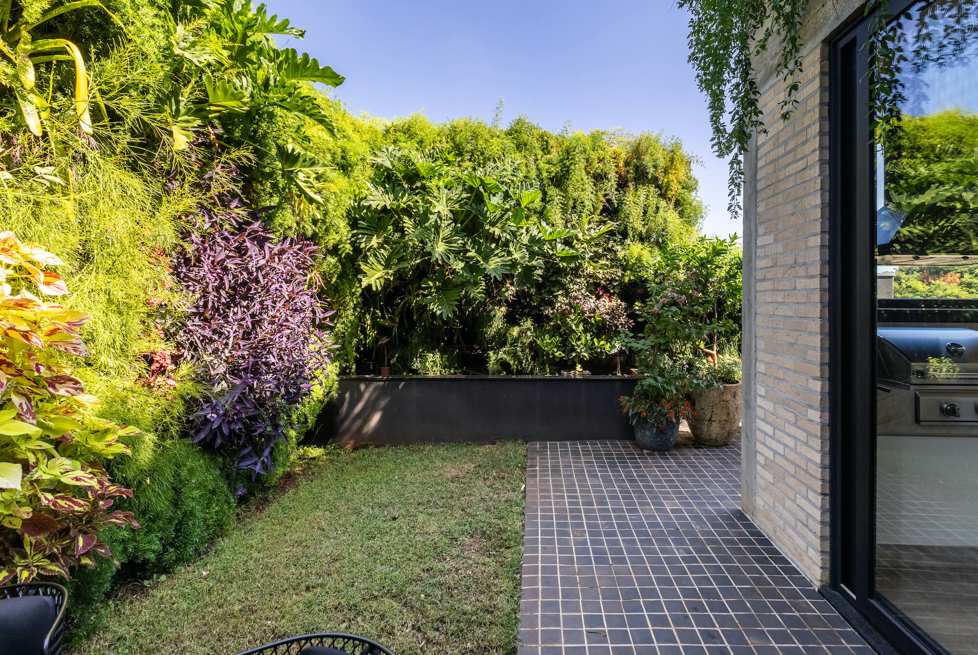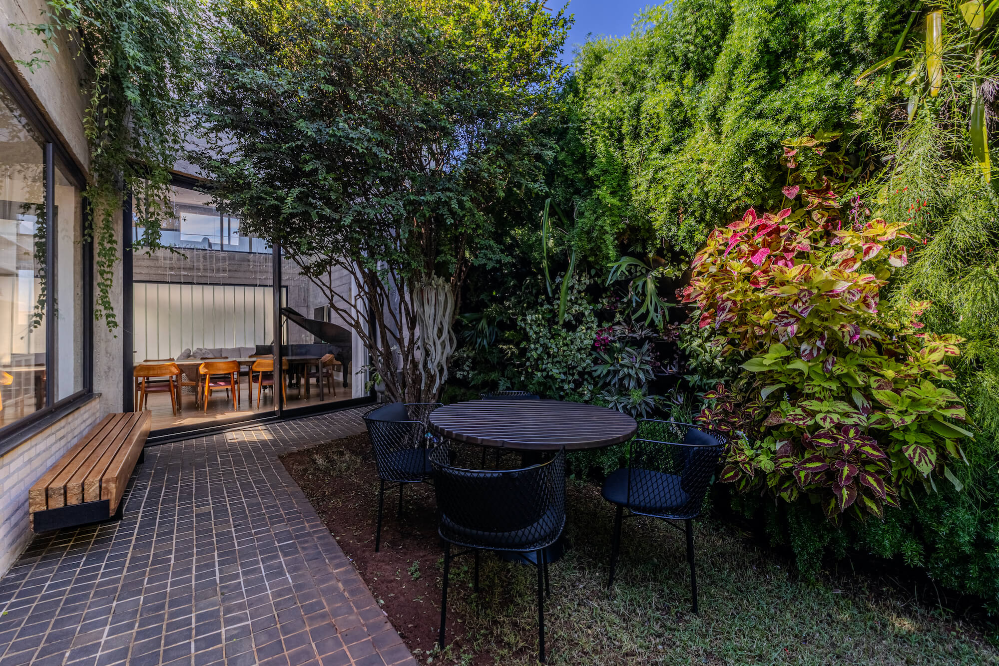 The sunlight and topography conditions led us to place the building on one side of the lot, which frees up more internal space, providing a strategic gap that connects the living spaces with the sheltered spaces. The living room opens onto a shaded garden. In addition to lighting the house, the garden provides natural ventilation and a view of the sky.